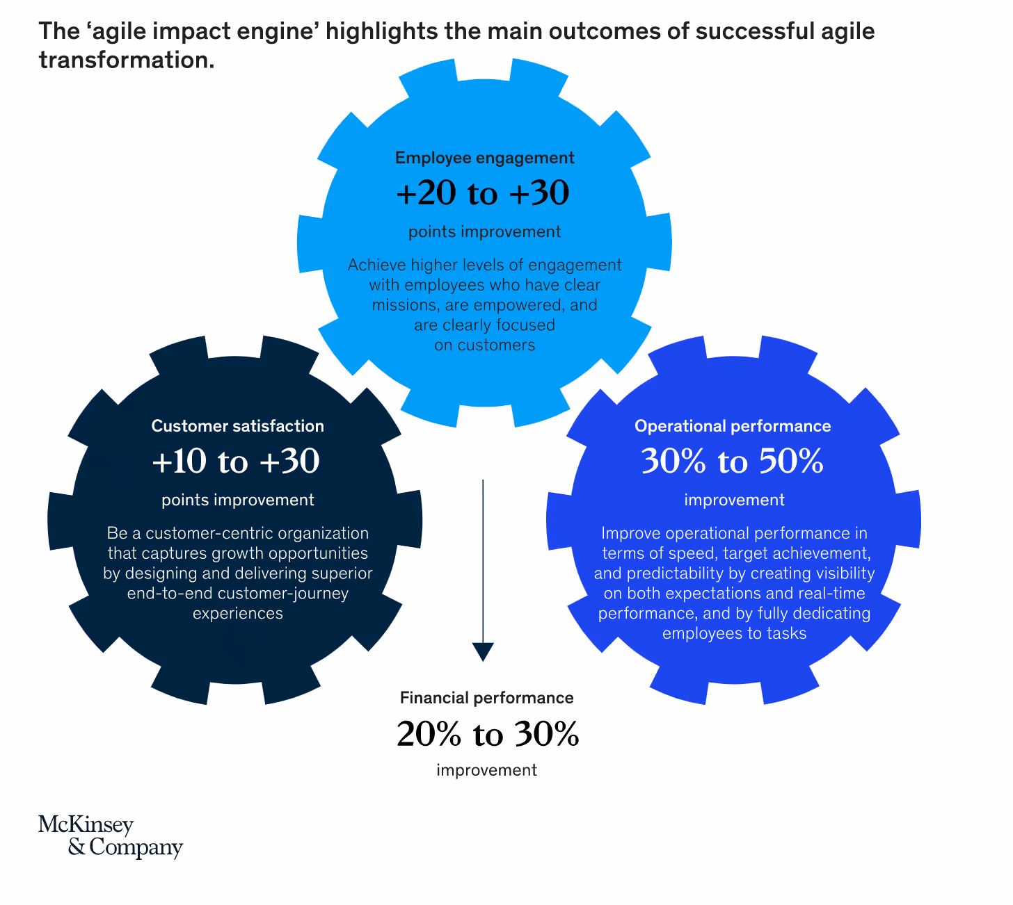 The following image of the ‘Agile impact engine’ is a visualisation of Mckinsey & Co’s preliminary results from their worldwide agile-research effort. They identified three main outcomes of agile transformations: improved customer satisfaction, employee engagement and operational performance.